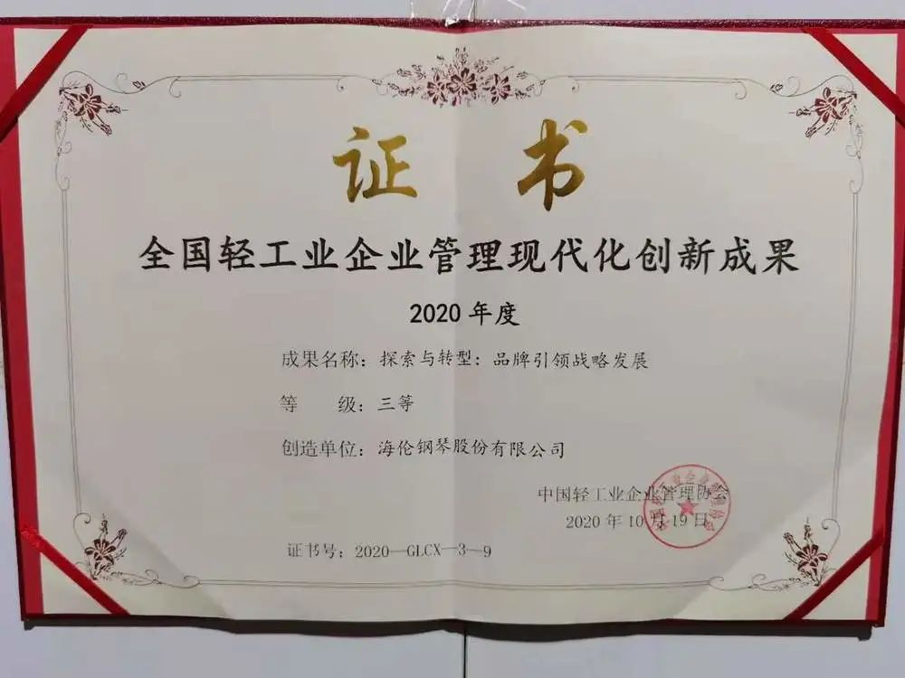 儀式上表彰了2020年全國輕工系統企業所取得的36項創新成果。這些成果是由企業申報后, 經過中國輕工業企業管理協會的嚴格審定,被確定為輕工企業現代化管理的創新成果。 其中海倫鋼琴股份有限公司榮獲”2020年度全國輕工業企業創新管理成果“三等獎。陳海倫、陳朝峰、陳斌卓等海倫鋼琴股份有限公司高層獲得了個人獲獎證書。 這些創新成果展示了中國輕工業系統企業在2020年度中,在戰勝疫情、復工復產,穩定勞動關系,以及生產“智能化“與數字化轉型等方面所取得成果。在大數據應用與平臺經濟發展、品牌培育與質量提升 、產業鏈與網絡整合、集團管控與組織變革、技術創新改造,人力資源管理與激勵機制、綠色發展與社會責任管理等各方面,相關獲獎單位都發揮了重要的作用、獲得了良好的反饋。 本次大會號召,大家要以黨的十九大精神為指引,深入開展管理現代化創新工作,努力挖掘內部潛力,苦練內功。宏揚企業家及工匠精神,在供給側結構性改革中不斷做出新貢獻!
