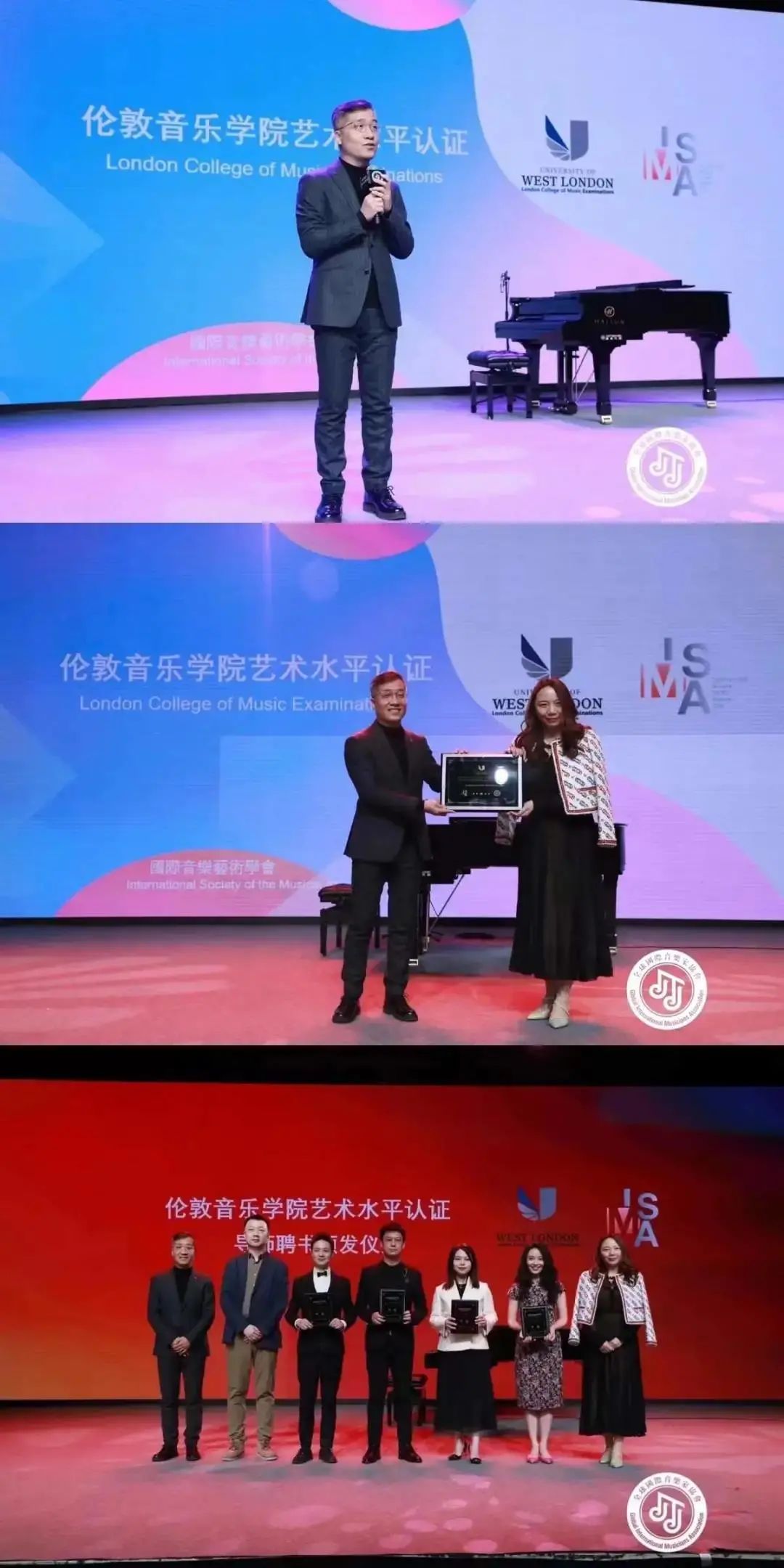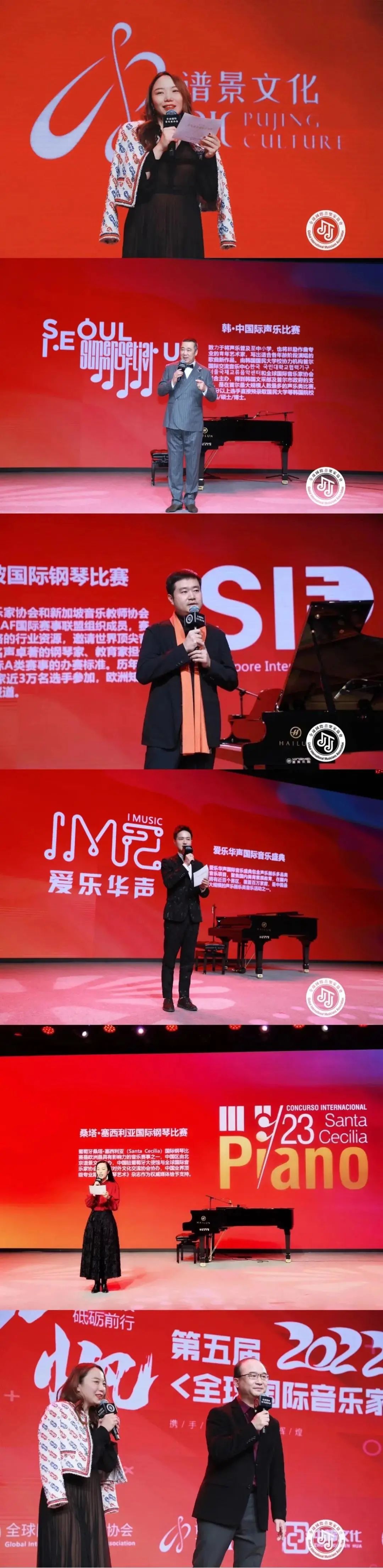 全球國際音樂家協會會長張一玫女士,韓·中國際聲樂比賽藝術總監——中央戲劇學院歌劇系教授孫健先生,新加坡國際鋼琴比賽藝術總監——天津茱莉亞學院預科鋼琴學科主任王笑寒先生,倫敦音樂學院LCME中國代表處梁崴先生,全球國際音樂家協會常務理事周慶頤先生,全球國際音樂家協會常務理事肖瀟女士向所有到場嘉賓發布了2022年全球國際音樂家協會所主辦的各項活動。
