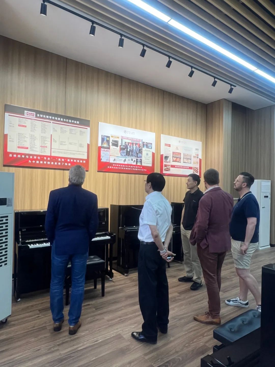 在陳海倫董事長的陪同下,來訪貴賓一同參觀了海倫鋼琴產品展示廳和榮譽室等,三位董事會成員對海倫鋼琴展廳、榮譽室及生產車間的設備和規模感到震撼,海倫鋼琴工廠是中國樂器制造業的標桿工廠,其工藝水平響徹海內外,更是受到眾多海內外資深音樂人的肯定。